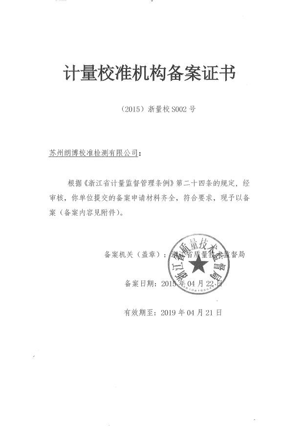 我司已通過浙江省計(jì)量校準(zhǔn)機(jī)構(gòu)備案有效期至2019年4月2日。朗博校準(zhǔn)檢測有限公司(簡稱朗博實(shí)驗(yàn)室)是...